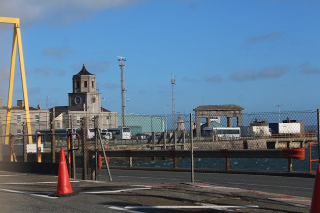 Below - The old Customs House, Harbour Office and George IV Arch seen through the fence of the port complex. The George IV arch was built to bookend the coach route from London with the Marble Arch.